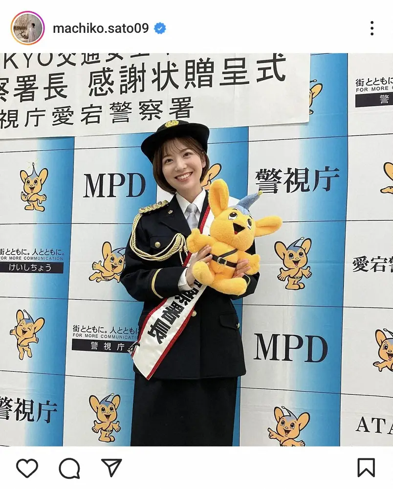 日本テレビの佐藤真知子アナウンサー(30)が7日までに自身のインスタグラムを更新。一日警察署長の制服姿を披露した。