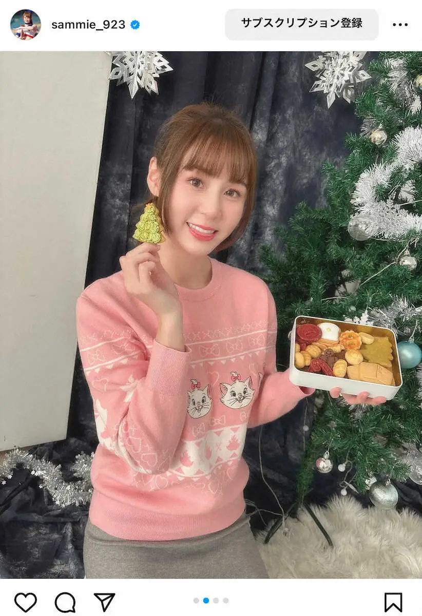 サミーは「感謝と幸せに満ちたクリスマスがやってくる!」とピンクのニット姿で、クリスマスツリーの前に座ってクッキーを“パクっと”食べる写真などを投稿した。