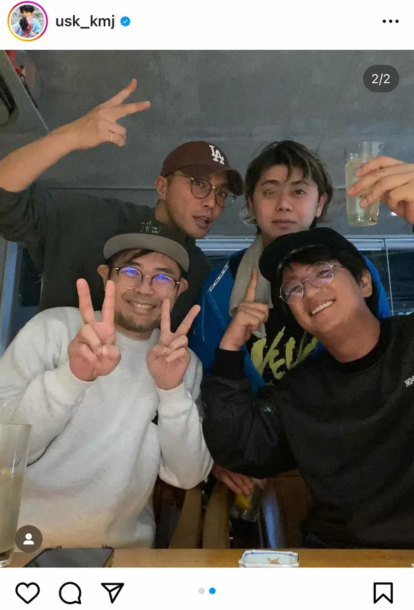 上地は「遠い親戚のよーな、戦友のよーな、同級生のよーな」とつづり、お笑いコンビ「品川庄司」の品川祐、元俳優の山田親太朗さん、「成宮寛貴」として活動していた元俳優の平宮博重氏との写真をアップ。