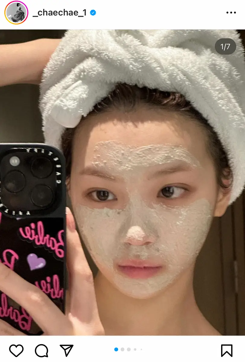 チェウォンは、韓国語で「間違い探し」とつづり、頭にタオルを巻き、顔のパックをしている写真をアップ。普段のメークアップした姿とは違った素顔を披露した。