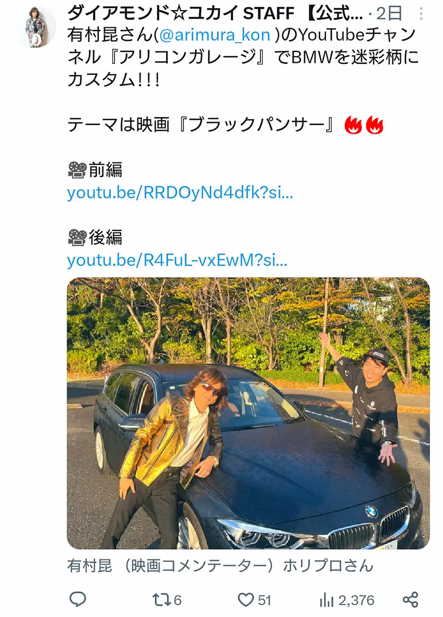 ダイアモンド☆ユカイ Photo by スポニチ ダイアモンド☆ユカイ 愛車のBMWを「ロックな車」にカスタマイズ ボディ… ギャラリーで見る この記事のフォト 2023年12月11日の画像一覧 もっと見る 2023年12月11日の画像をもっと見る