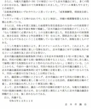 志木市は、おかもとさんとの再婚が発表された11日に「本日、令和5年志木市議会12月定例会の一般質問に、与儀大介議員に対する辞職勧告決議案が提出され、議決しました」と報告した。