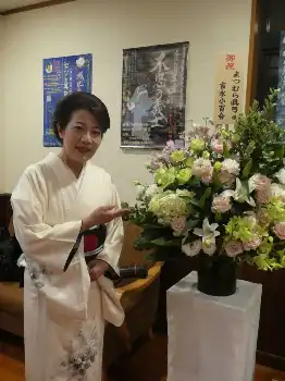 親交のある女優の吉永小百合から花も届いて、まつむらは恐縮しきり。そんな中、「怪談たたり三味線 貳の糸『不忠の義士』」と「セツと耳なし法師の物語」の2演目を熱演した。背後に流れる琵琶楽曲は宝塚歌劇団花組の元トップ娘役で、筑前琵琶旭会の後継者として活躍した故上原まりさんの音源。朗読を重厚に彩った。