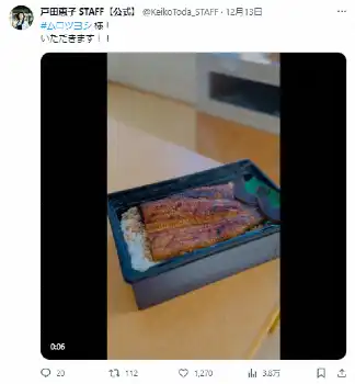 「ムロさま。ありがとうございます」とムロからの差し入れだと明かした上、弁当を前に正座して深々とお礼した戸田は、「謹んで頂きまする。これが美味しいのよぉ」と湯気の立ち上る鰻を堪能した様子だった。