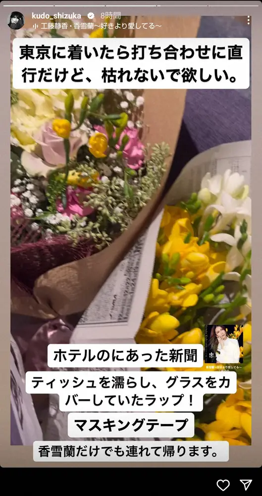 歌手の工藤静香 Photo by スポニチ 工藤静香 「ホテルにあった新聞」で生花を持ち帰るライフハック「打ち合… ギャラリーで見る この記事のフォト 2023年12月15日の画像一覧 もっと見る 2023年12月15日の画像をもっと見る