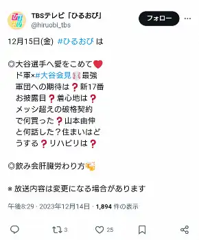 「大谷への愛をこめて」から始まる同番組の告知欄の頭文字をつなぐと「大谷ド軍おメでとう」に。同番組は14日夜に更新した番組の公式X(旧ツイッター)にも、縦読みすると「ド軍おメでとう」となる投稿をした。