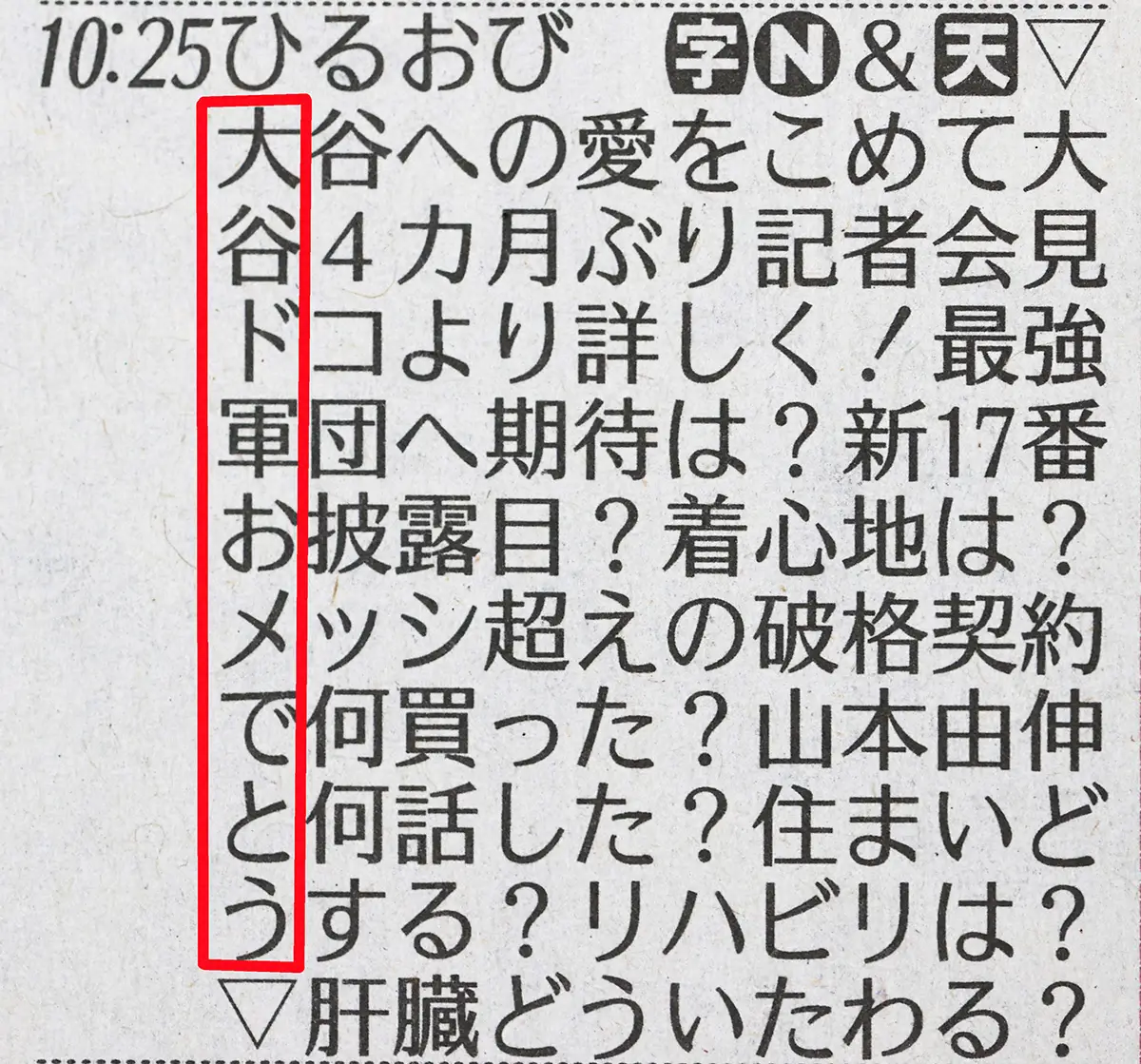 ドジャースと10年契約を結んだ大谷翔平投手(29)が14日午後3時(同15日午前8時)、本拠地のドジャースタジアムで入団会見を行う。新天地で第一歩を記す日に、TBS系の情報番組「ひるおび」(月~金曜前10・25)は新聞各紙のテレビ欄に「縦読み」メッセージを掲載、大谷の門出を祝福した。