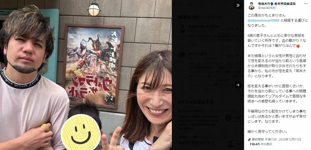 元タレントでクリエイターのおかもとまりさん(33)との結婚を発表した埼玉県志木市の与儀大介市議会議員(32)が18日、自身のX(旧ツイッター)を更新。この日、入籍したことを発表した。