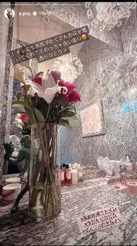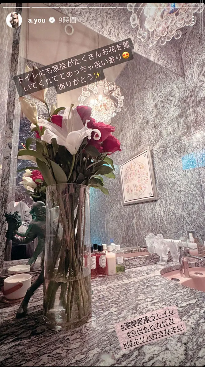 浜崎は、百合やバラの花が飾られたトイレの写真を投稿し「トイレにも家族がたくさんお花を置いてくれててめっちゃ良い香り ありがとう」と感謝。