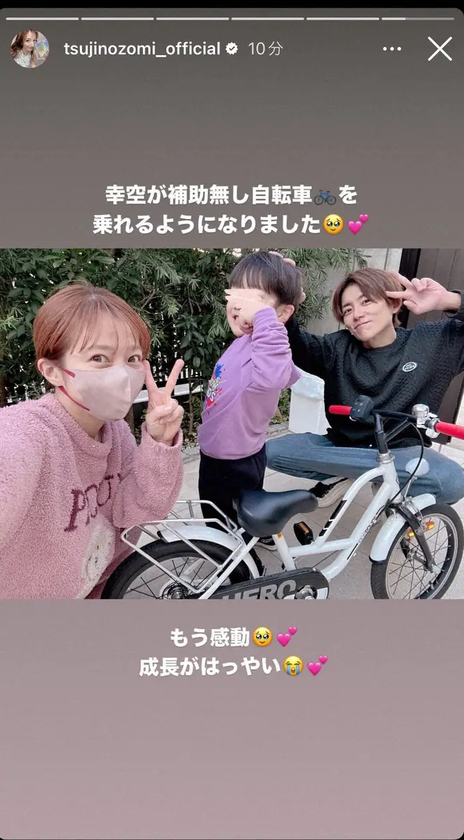 辻は、杉浦と幸空くんとの3ショットを投稿し、「幸空が補助なし自転車を乗れるようになりました もう感動 成長がはっやい」と喜びをつづった。