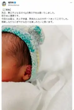 福田は生まれたばかりの我が子の写真を添え「先日、第三子となる3016gの男の子を出産いたしました」と報告。「母子共に健康です」と呼びかけた。