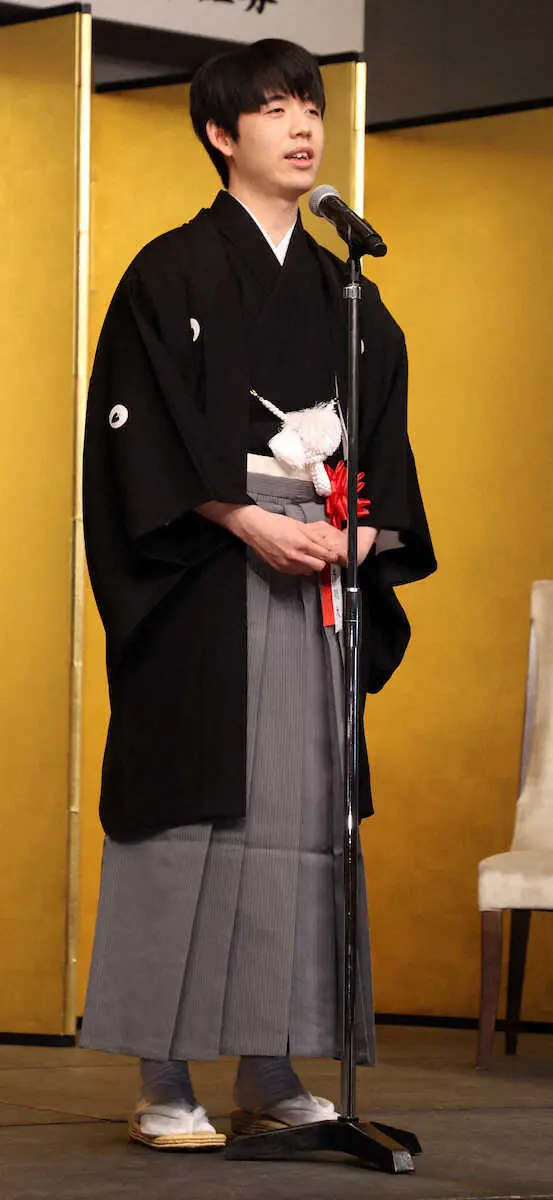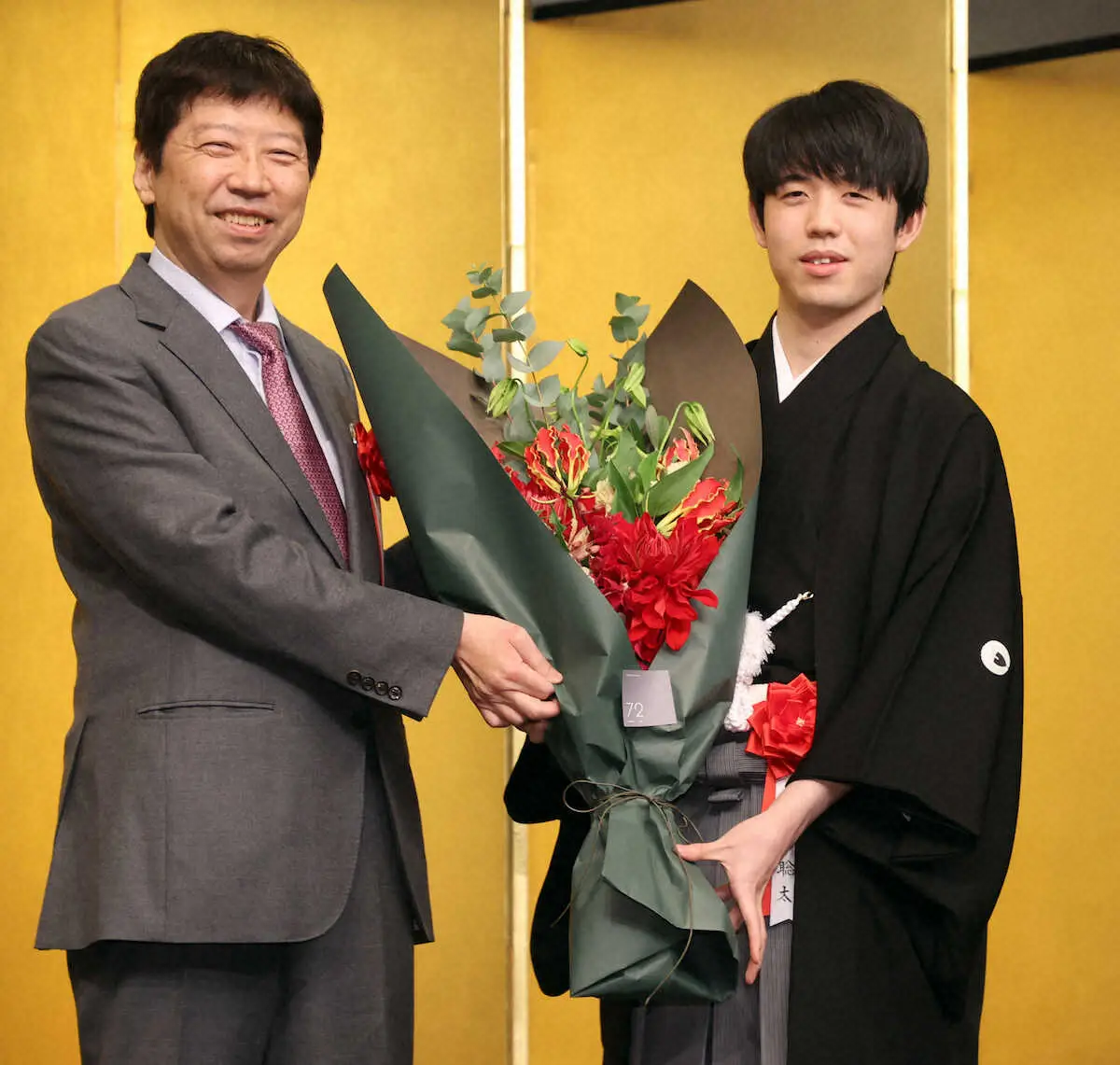北川・東海証券社長(左)から副賞を手渡された藤井王座(撮影・久冨木 修) Photo by スポニチ 藤井聡太王座 史上初8冠獲得に心境吐露「本当に幸運」 王座就位式で謝辞… ギャラリーで見る この記事のフォト 2023年12月23日の画像一覧 もっと見る 2023年12月23日の画像をもっと見る