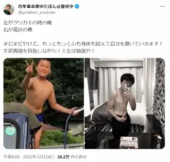 X(旧ツイッター)でも、「左がクソガキの時の俺 右が最近の俺」と記し、2枚の写真をアップ。「まだまだやけど、もっともっと心も身体も鍛えて自分を磨いていきます!文武両道を目指しながら!人生は勉強や!」と添えた。