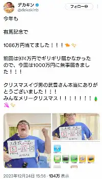 デカキンはレース中にYouTubeチャンネルで生配信を実施。ドウデュース、スターズオンアース、全頭の3連複で見事1086万円を的中。レース後、Xには「今年も有馬記念で1086万円当てました!!!前回は974万円でギリギリ届かなかったので、今回は1000万円に無事届きました!!!」と投稿。