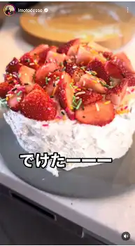 イモトは「はじめてのスポンジケーキ 何がむずいってオープンの使い方をマスターしてないままとりあえず焼いてみたら予熱中にブレーカー落ちーのてんやわんや 何とか焼けたが膨らまないandちょい焦げ」とつづり、動画でも「はじめてのケーキ作り 間撮影する余裕無し そして若干焦げる 逆さにしてごまかす」など、奮闘した様子がうかがえる。