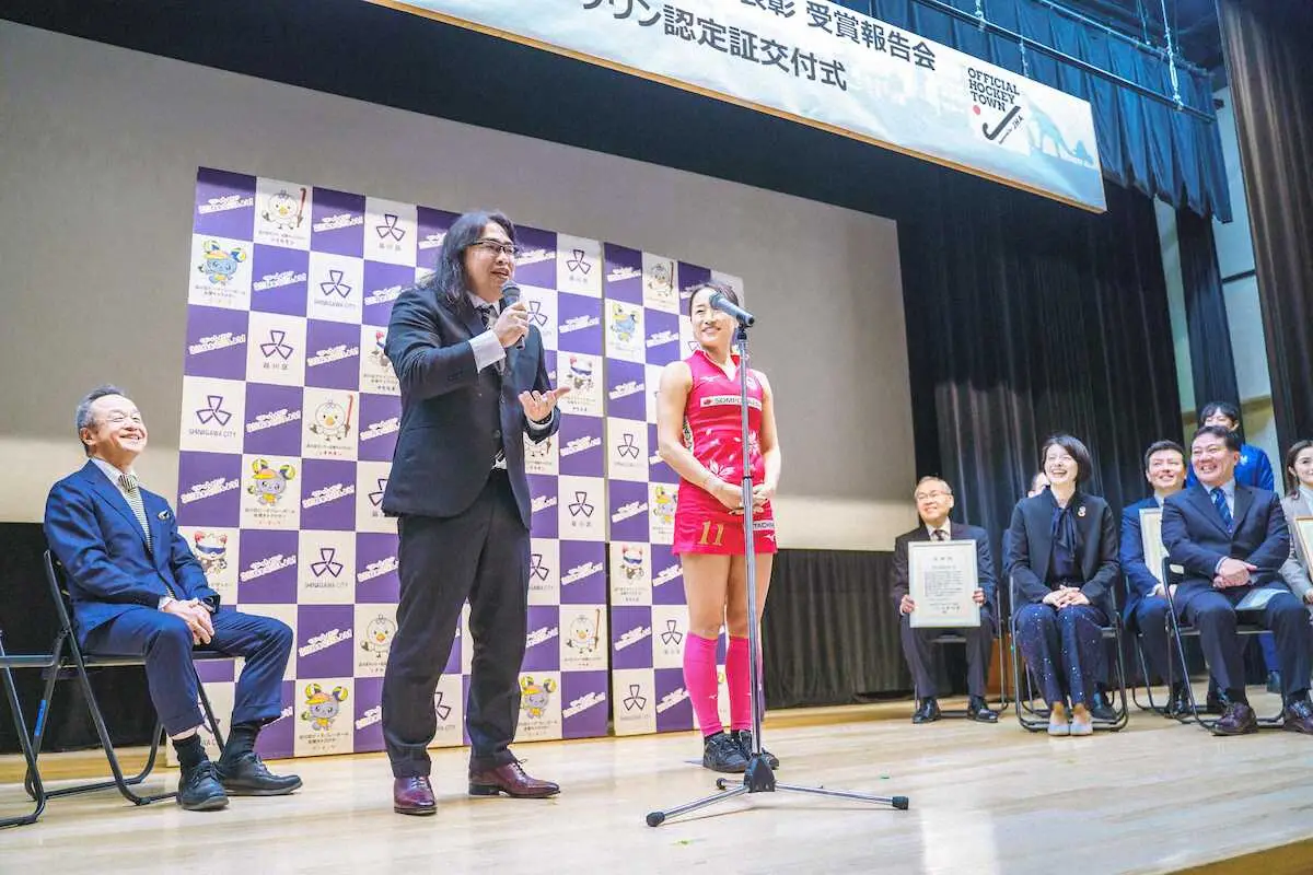 会場には、品川区民で女子ホッケー日本代表の及川栞選手ら関係者50人以上が駆けつけた。日本ホッケー協会公認のホッケーアンバサダーを務める中岡は「中学高校とホッケーをやっていました。(日本ホッケー協会に)直談判してアンバサダーをやらせていただいています」と挨拶。