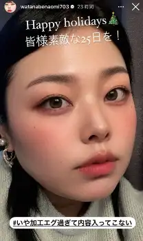 25日のクリスマスに「Happy holidays 皆様素敵な25日を!」と、自撮りを添えてファンへ呼びかけた渡辺。公開されたのは、はかなげなメークで、いつもと違う印象の自撮り。渡辺自身も「いや加工エグ過ぎて内容入ってこない」と驚いていた。