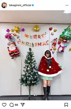 高城は「Happy Merry Xmas」とつづり、ミニスカートの上にサンタ風の赤いポンチョを着た写真を投稿。クリスマスの装飾がされた部屋で笑顔を浮かべている姿を公開した。