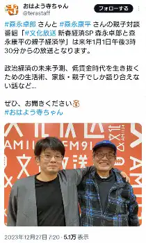 おはよう寺ちゃん公式X(@terastaff)から すい臓がんステージ4公表の森永卓郎氏の長男・康平氏 病名は確定していな… ギャラリーで見る この記事のフォト 2023年12月27日の画像一覧 もっと見る 2023年12月27日の画像をもっと見る