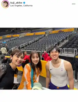 久慈「LAで三上さんと会えたときの」とつづり、NBAのロサンゼルス・レイカーズ本拠地の前でのツーショットを投稿。スタジアム内で撮影した渡辺との貴重なスリーショットも投稿した。
