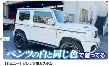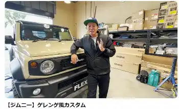 ヒロミはベージュ系のジムニーを用意し、車高のリフトアップ、ブレーキ変えてタイヤも交換、さらに外装のフロントパーツ、バックパーツ、サイドステップ、オーバーフェンダー、フロントグリル、ボンネットも全部はずし、ゲレンデ風のパーツと交換。その時点で「ぽいってのが大事。よーく見なきゃ大丈夫」と笑った。