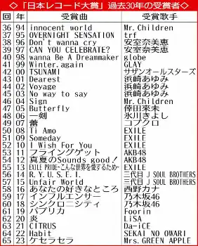 ≪デビュー20周年JUJUが最優秀歌唱賞≫ 最優秀歌唱賞にはJUJU(年齢非公表)が選ばれた。今年デビュー20周年を記念し、今年5月から昭和歌謡を中心に歌い上げるカバーライブ「スナックJUJU」を全国47都道府県で開催。来年2月17日には、東京ドームでの公演も控えている。紅白歌合戦にも出場し、テレサ・テンの「時の流れに身をまかせ」を披露する。どのようなステージになるか注目だ。