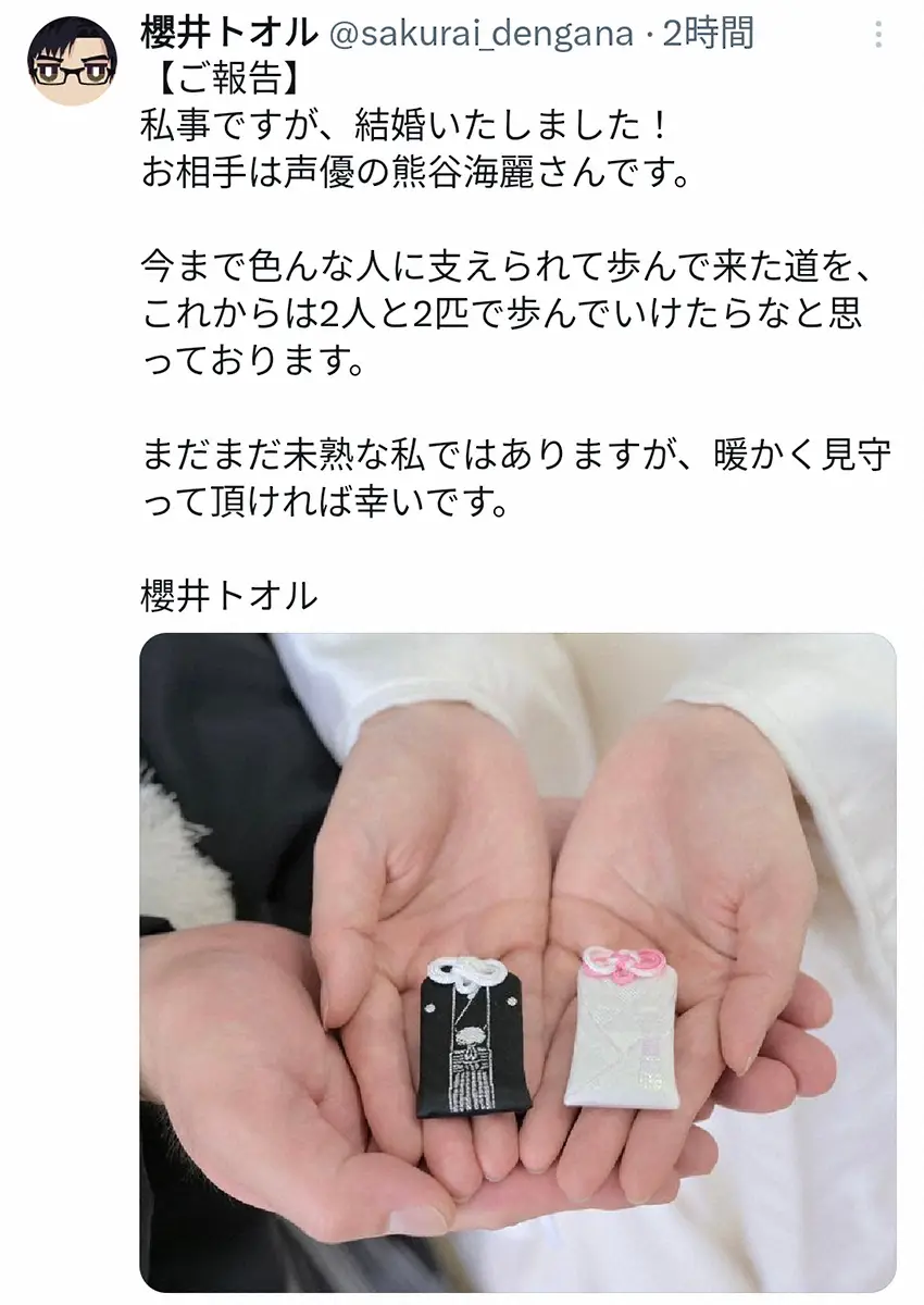 声優の櫻井トオルと熊谷海麗が31日、それぞれのX(旧ツイッター)を更新し、結婚を発表した。