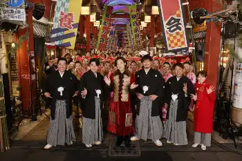 歌唱中は、アルコ&ピースの平子祐希が刀を振り下ろすと、酒井健太の着物が真っ二つ。酒井は金のふんどし姿で、背中には「有吉さんガンバレ」の文字が描かれて歓声が挙がった。