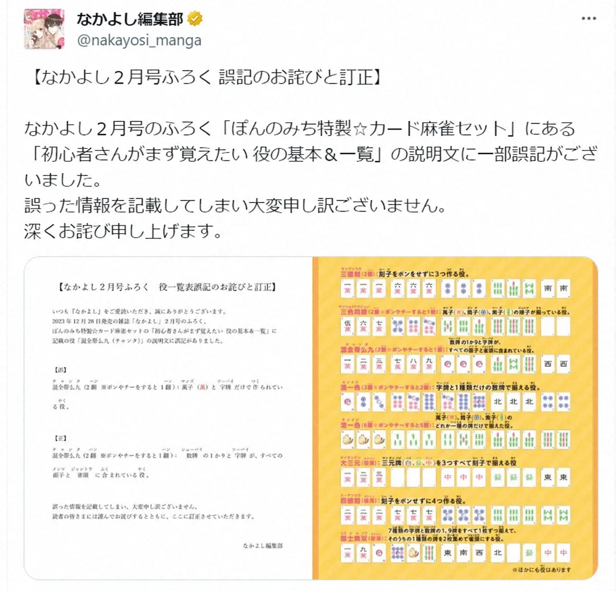今月28日に発売された少女漫画雑誌「なかよし」(講談社)2月号の付録「ぽんのみち特製☆カード麻雀セット」にある「初心者さんがまず覚えたい 役の基本&一覧」の説明文に一部誤記があり、同誌編集部は31日夜、公式SNSで謝罪した。連載中の漫画「ぽんのみち」がテレビアニメ化され、来年1月の放送スタートを記念し、同誌史上初となる異色の付録として話題を集めていた。