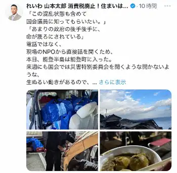 山本太郎公式X(@yamamototaro0)から れいわ山本太郎氏 「国会議員に知ってもらいたい」現場のSOSに…被災地入… ギャラリーで見る この記事のフォト 2024年01月06日の画像一覧 もっと見る 2024年01月06日の画像をもっと見る