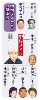 夫は作曲家の神津善行氏、次女の夫は俳優の杉本哲太…中村メイコさん家系図 Photo by スポニチ 女優の中村メイコさんが死去、89歳 肺塞栓症で昨年12月31日に…12月25日番… ギャラリーで見る この記事のフォト 2024年01月07日の画像一覧 もっと見る 2024年01月07日の画像をもっと見る