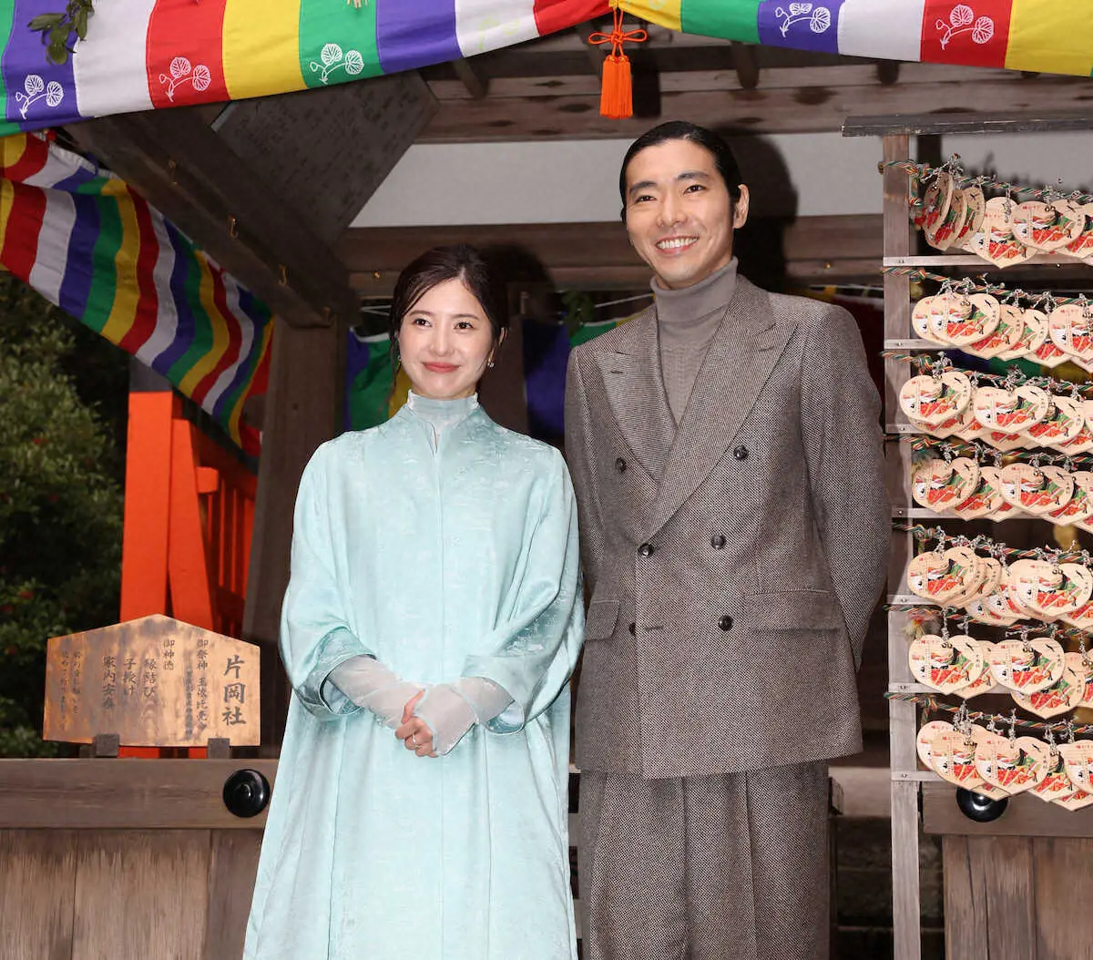 <大河ドラマ『光る君へ』>上賀茂神社にある片山御子神社(片岡社)で写真撮影を行う吉高由里子(左)と柄本佑の2人 (撮影・亀井 直樹)