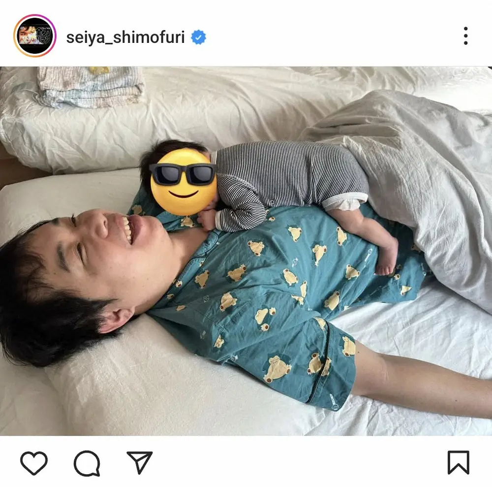 せいやは「粗品誕生日おめでとう」とつづると、仰向けになる自身の上に第1子がうつぶせとなっているショットをアップ。
