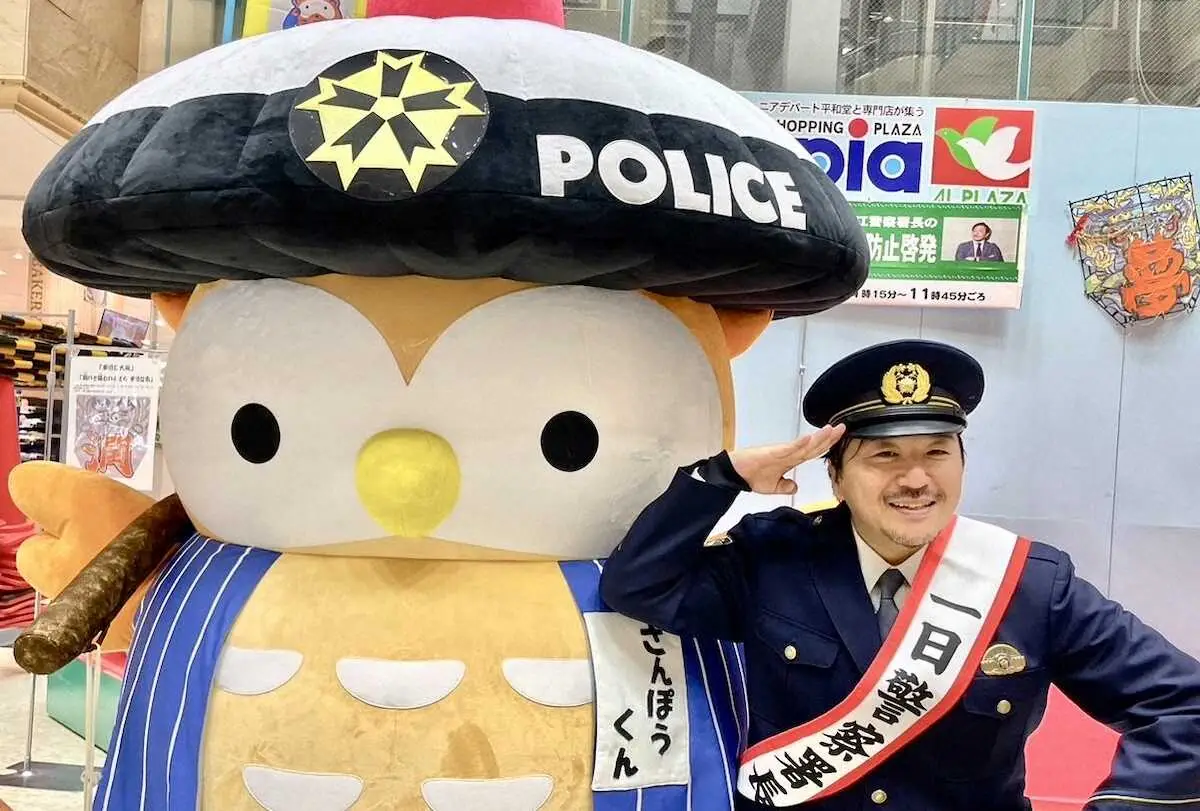 制服姿で登場した今村氏は、初体験とあってやや緊張した表情で初宿(しやけ)亨署長から委嘱状を受け取り、署員を前に講話。その後は、近江鉄道の駅のショッピングプラザセンターに場所を移し、同署の防犯マスコットキャラクター「さんぽうくん」とともに啓発活動に励んだ。
