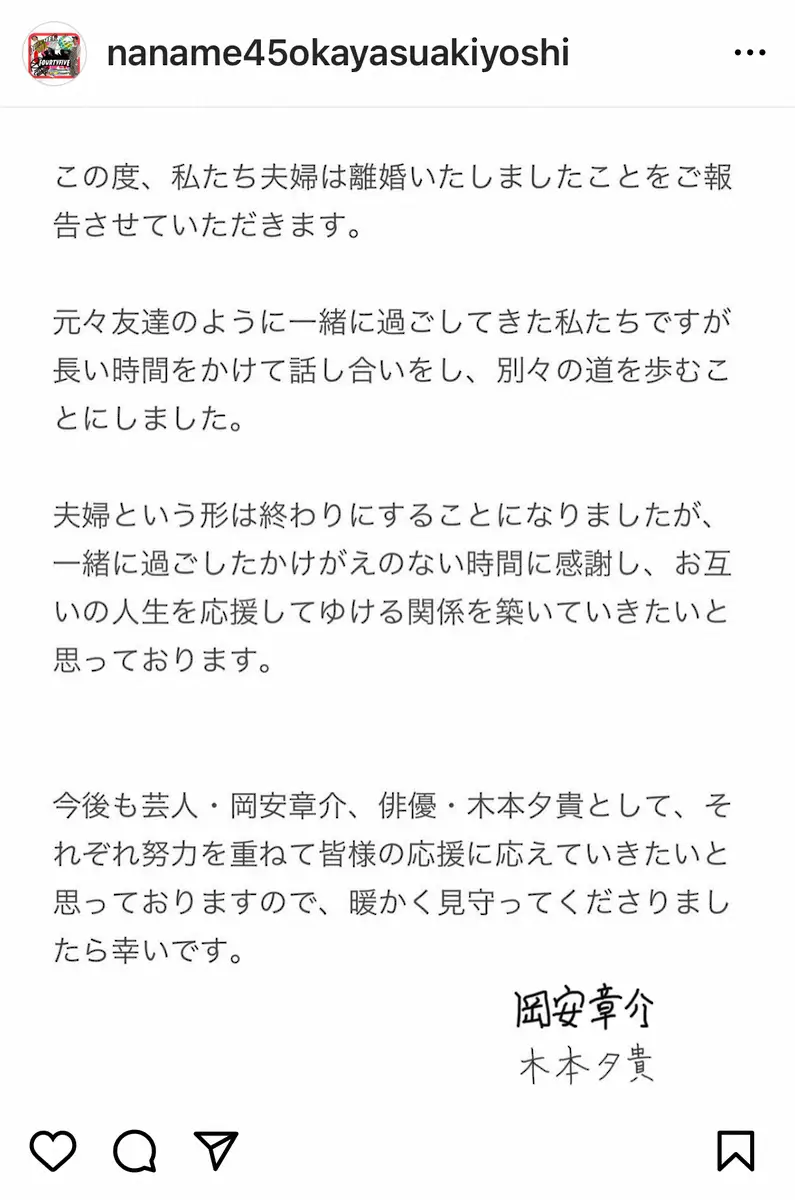 離婚を発表した「ななめ45°」の岡安章介(左)と元SDN48の木本夕貴 Photo by スポニチ ななめ45°岡安と元SDN木本夕貴が離婚「長い時間をかけて話し合いをし、別… ギャラリーで見る この記事のフォト 2024年01月11日の画像一覧 もっと見る 2024年01月11日の画像をもっと見る