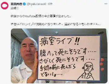 腎臓がんのため関西の病院に入院中の、作家で政治団体「日本保守党」代表の百田尚樹氏(67)が11日、自身のX(旧ツイッター)を更新。病院側から「病室からのライブ配信はNG」と要請があったことを報告した。