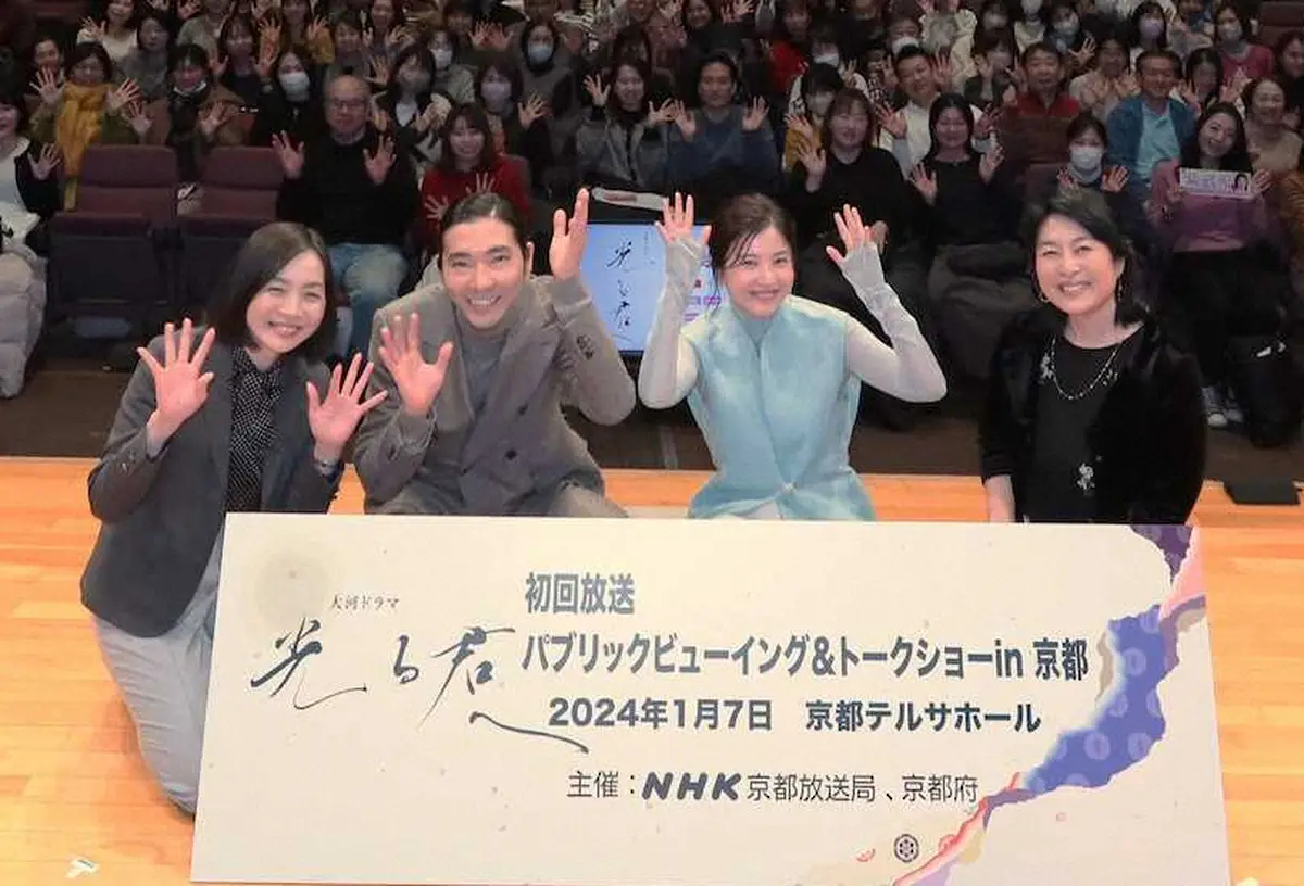 NHK大河ドラマ「光る君へ」の初回放送に合わせてトークショーを開催した(左から)制作統括の内田ゆき氏、柄本佑、吉高由里子、岩槻里子アナウンサー