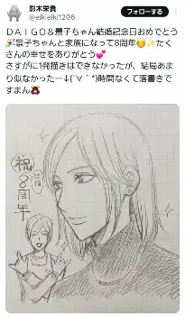 「DAIGO&景子ちゃん結婚記念日おめでとう 景子ちゃんと家族になって8周年 たくさんの幸せをありがとう」と祝福し、「さすがに1発描きはできなかったが、結局あまり似なかったー 時間なくて落書きですまん」とつづった。