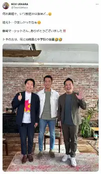 上原氏もXで「藤崎マーケット」との3ショットを掲載。「何の番組で、いつ放送かは後ほど…」としながらも、「地元トーク楽しかったなぁ 藤崎マーケットさん…ありがとうございました!!トキの方は、何と幼稚園と中学校の後輩」と明かしていた。
