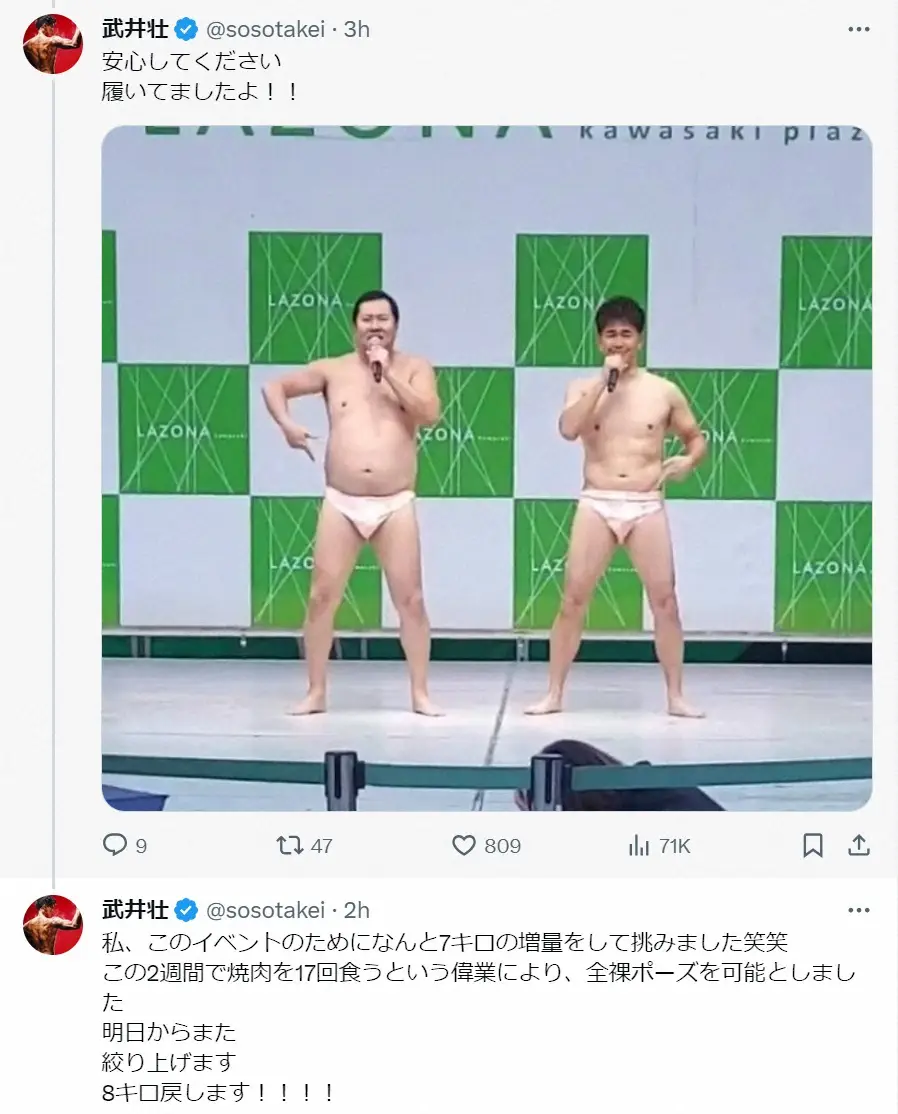 この日、神奈川・ラゾーナ川崎で開催された安村とのコラボイベントに出演したもので「全裸ポーズを決めるためのプロ意識で、腹を中心に脂肪を蓄えた」と告白。