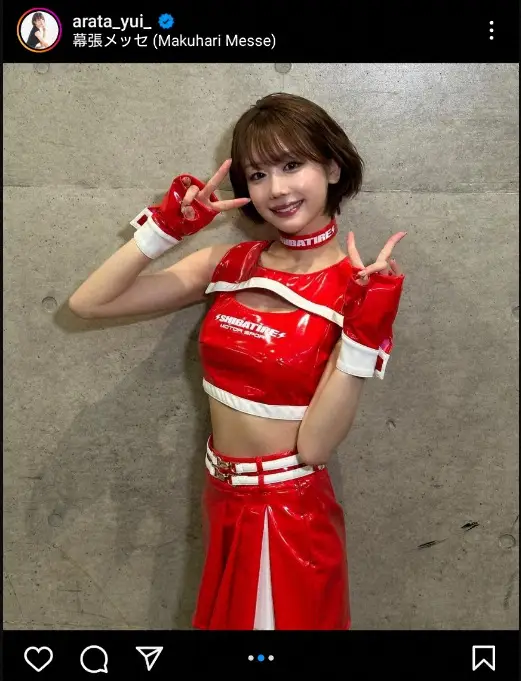 「Newコスチュームです」とつづり、東京オートサロン2024でのシバタイヤの真っ赤なミニ丈のセパレート・コスチューム姿の写真をアップした。