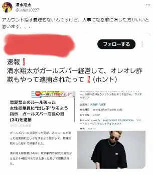 今月13日、ガールズバーを経営する清水翔太容疑者が逮捕されたと報じられた。同姓同名の別人だが、一部ユーザーが、清水の写真を使用し「ガールズバー経営していて、オレオレ詐欺もやっている」「逮捕された」などと“デマ”情報を投稿した。
