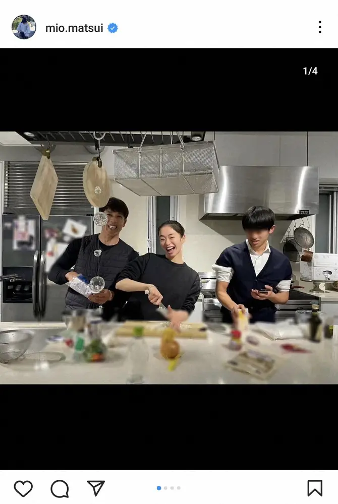 15日に誕生日を迎えた美緒は「…誕生日。半世紀祝いのリクエストは1人1人が作った夜ごはんが食べたい!!でした~」と書き出すと、稼頭央監督、長女でモデルの松井遥南と長男の3人がキッチンで料理をするショットをアップ。