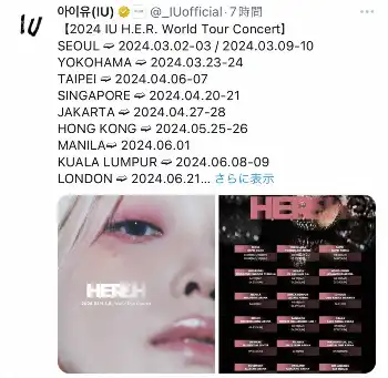 韓国で「国民の妹」として愛されている“歌姫”IU(30)が17日、「2024 IU H.E.R. World Tour Concert」の日程を発表。日本でも高い人気を集める“歌姫”の初日本公演開催に、話題が集まっている。