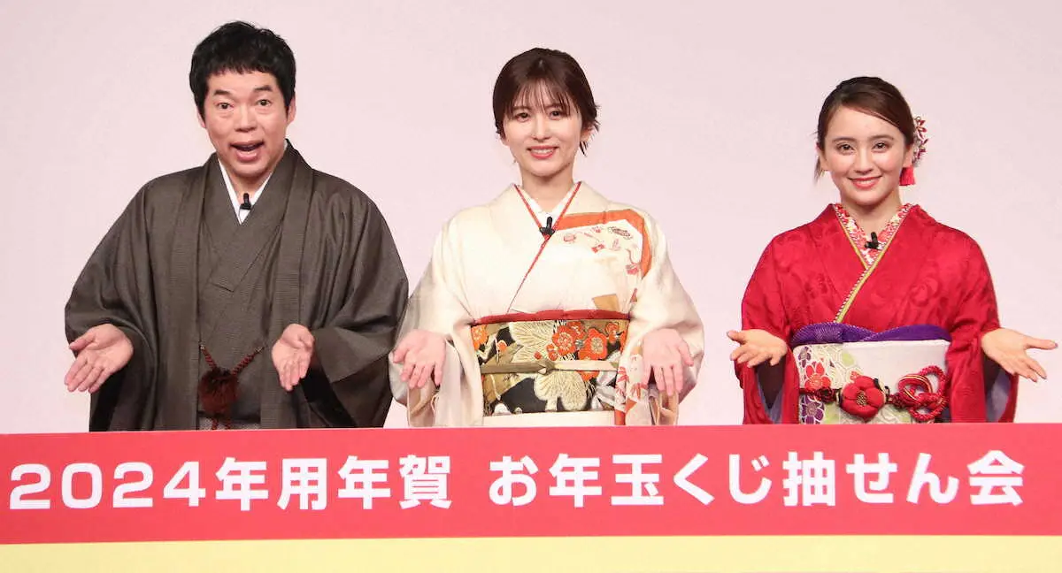 <2024年用年賀 お年玉くじ抽せん会>イベントに出席した(左から)今田耕司、宇賀なつみ、岡田結実
