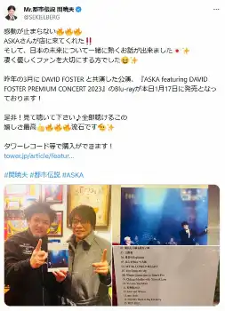 関は「感動が止まらない」と投稿。「ASKAさんが店に来てくれた!!」と2ショット写真を添え、「日本の未来について一緒に熱くお話ができました すごく優しくファンを大切にする方でした」と伝えた。