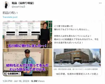 「粗品の呪い」とつづるとともに、自身がYouTubeで「なあ藤田伸二」と語り掛けている画像や、藤田容疑者の逮捕を報じるHBC北海道放送の記事などを投稿した。