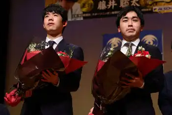 <第73期ALSOK杯王将戦第2局・前日>前夜祭で子供達から花束を贈呈された藤井王将(左)と菅井八段(撮影・大城 有生希、西尾 大助、光山 貴大、藤山 由理) Photo by スポニチ 20日開幕の王将戦前夜祭 対局に向けて意気込み 藤井王将「積極的な将棋… ギャラリーで見る この記事のフォト 2024年01月19日の画像一覧 もっと見る 2024年01月19日の画像をもっと見る