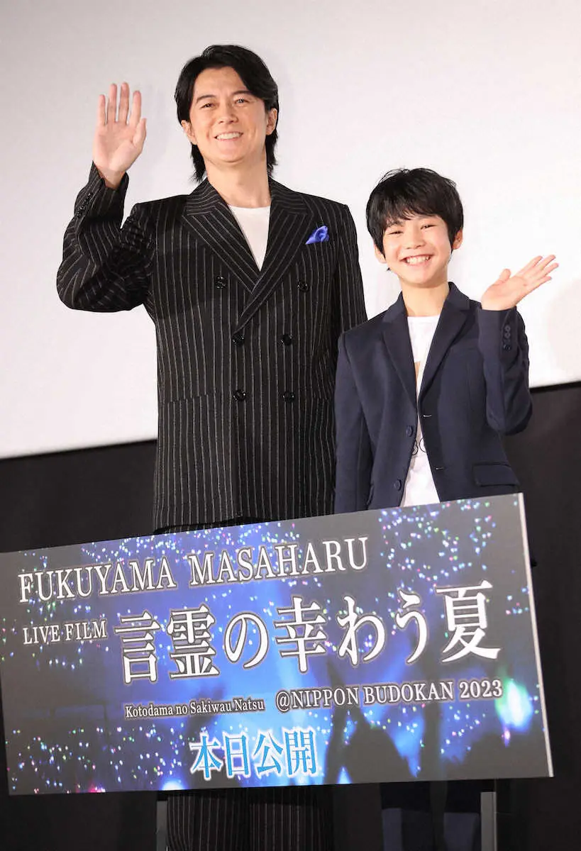 物語性も持たせており、10代の福山少年が54歳の福山のライブを見るという時空を超えたストーリー。少年を演じた柊木陽太(12)も登壇。福山に「ギターを弾くんですよ」と紹介されると「福山さんに頂いたピックを大切に使ってます」とはにかんだ。すると福山は「今日もピックいっぱい持ってきたから」と壇上でプレゼントした。