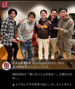 同番組では、浜田が思いつきから音楽フェス「ごぶごぶフェス」開催を提案。5月11、12日に大阪・万博記念公園もみじ川芝生広場で開かれることとなった。同フェスについて「知り合いのミュージシャンに怒られた。今日、その人を呼んでる」とライセンス・井本貴史が招き入れると、スタジオは爆笑。「お父さん、来たよ」と登場したハマに、浜田は「オマエ(井本)に偉そうに言うてたんは、郁未(ハマの本名)やったんか」と脱力した。